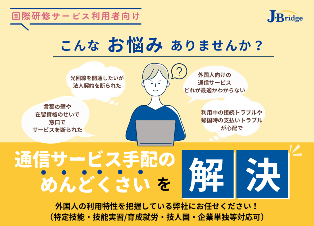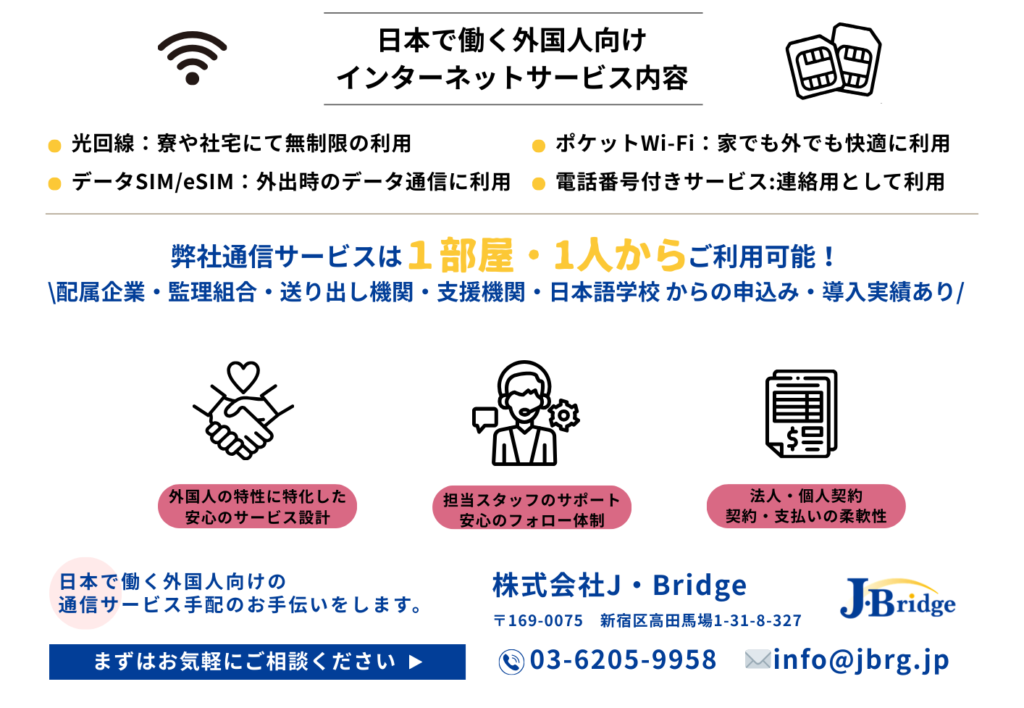 お問い合わせ 《ご導入事例》 -お問い合わせ- 担当者が、導入へのご相談やお見積もりをいたします。何かご不明な点があれば下記フォームよりお気軽にお問い合わせください。 このフォームに入力するには、ブラウザーで JavaScript を有効にしてください。社名 *ご担当者氏名 *メールアドレス *メールアドレスメールアドレスを確認連絡可能な電話番号 *お問い合わせ件名 *-- 選択 --光回線データ専用SIMカード・eSIMポケットWi-Fi日本の電話番号が欲しい法人契約について法人請求書について見積作成したいその他お問い合わせ内容 *送信 法人契約・個人契約どちらも可能です♪「日本で働く外国人向けのインターネットサービス」はJ・Bridgeにお任せください!